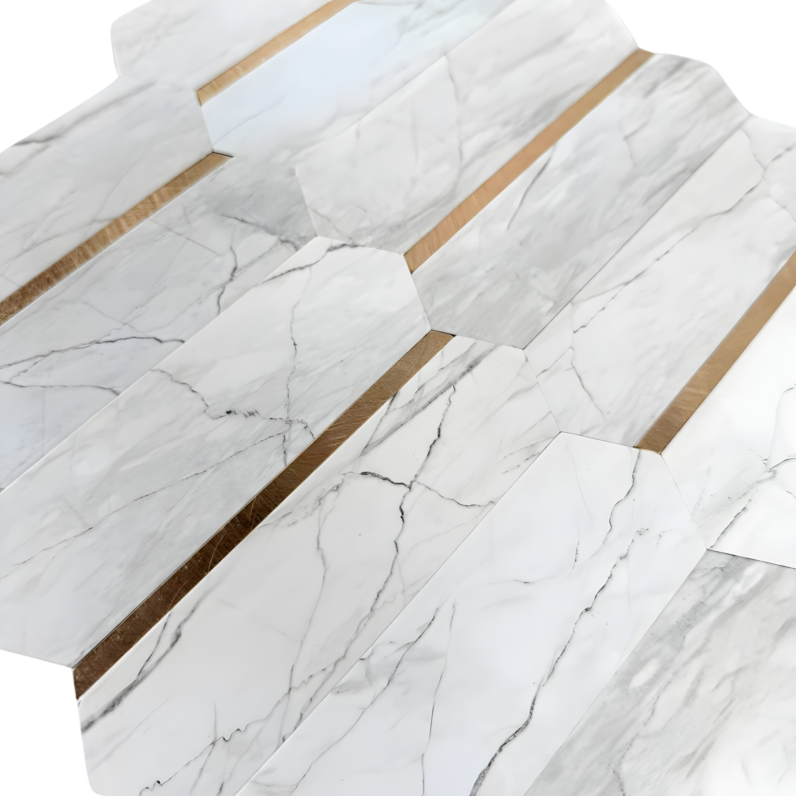 A modern twist on classic marble – the White Marble Pinstripe panel combines elegant veining with warm metallic accents. Ideal for creating sleek, timeless wall features.