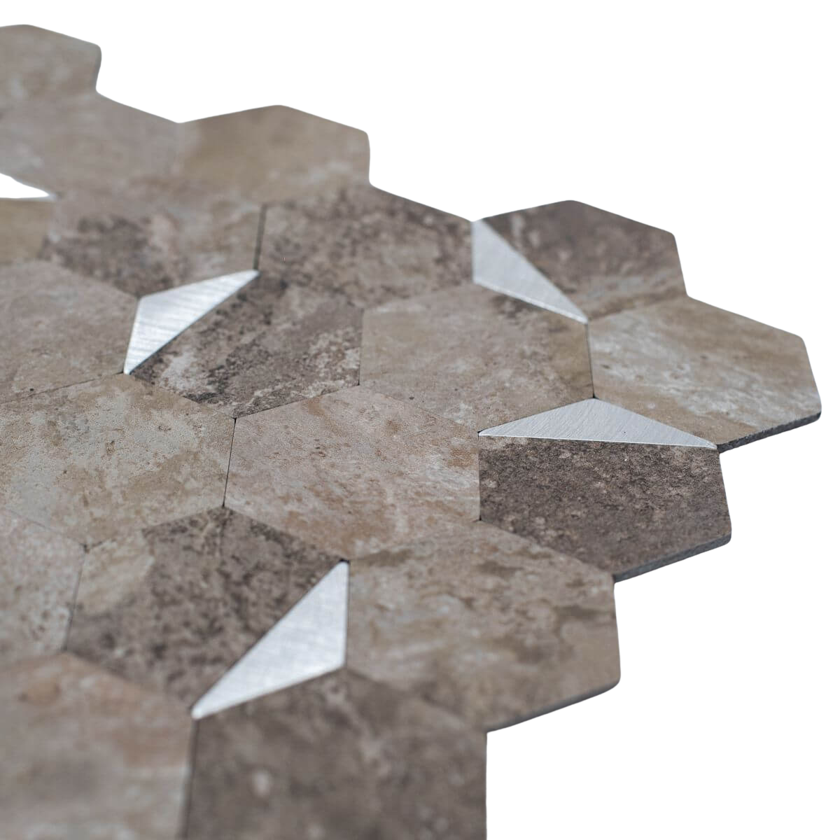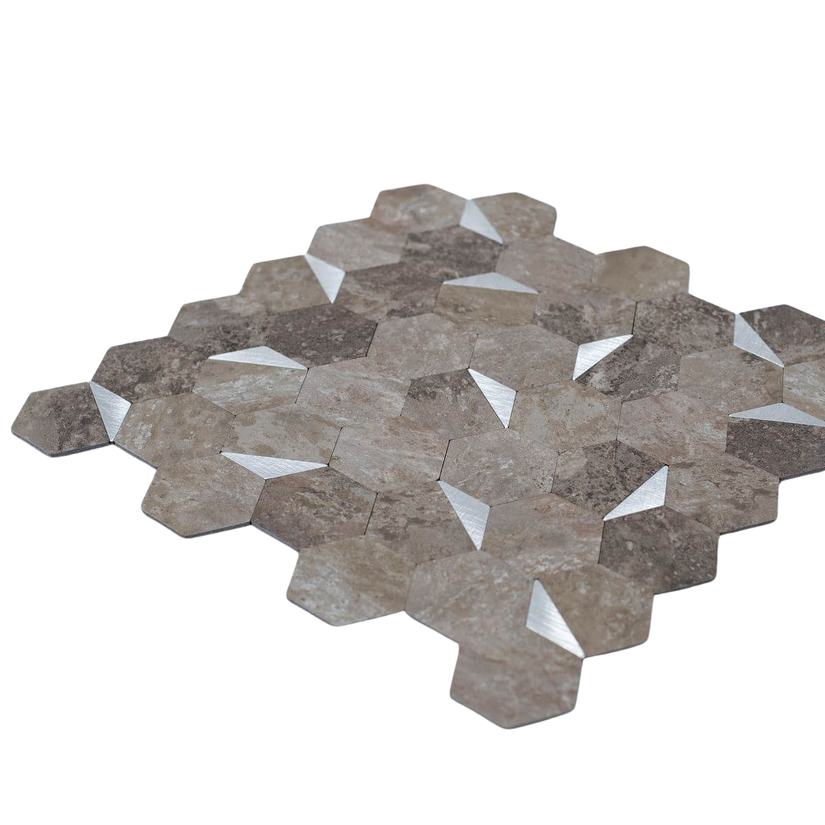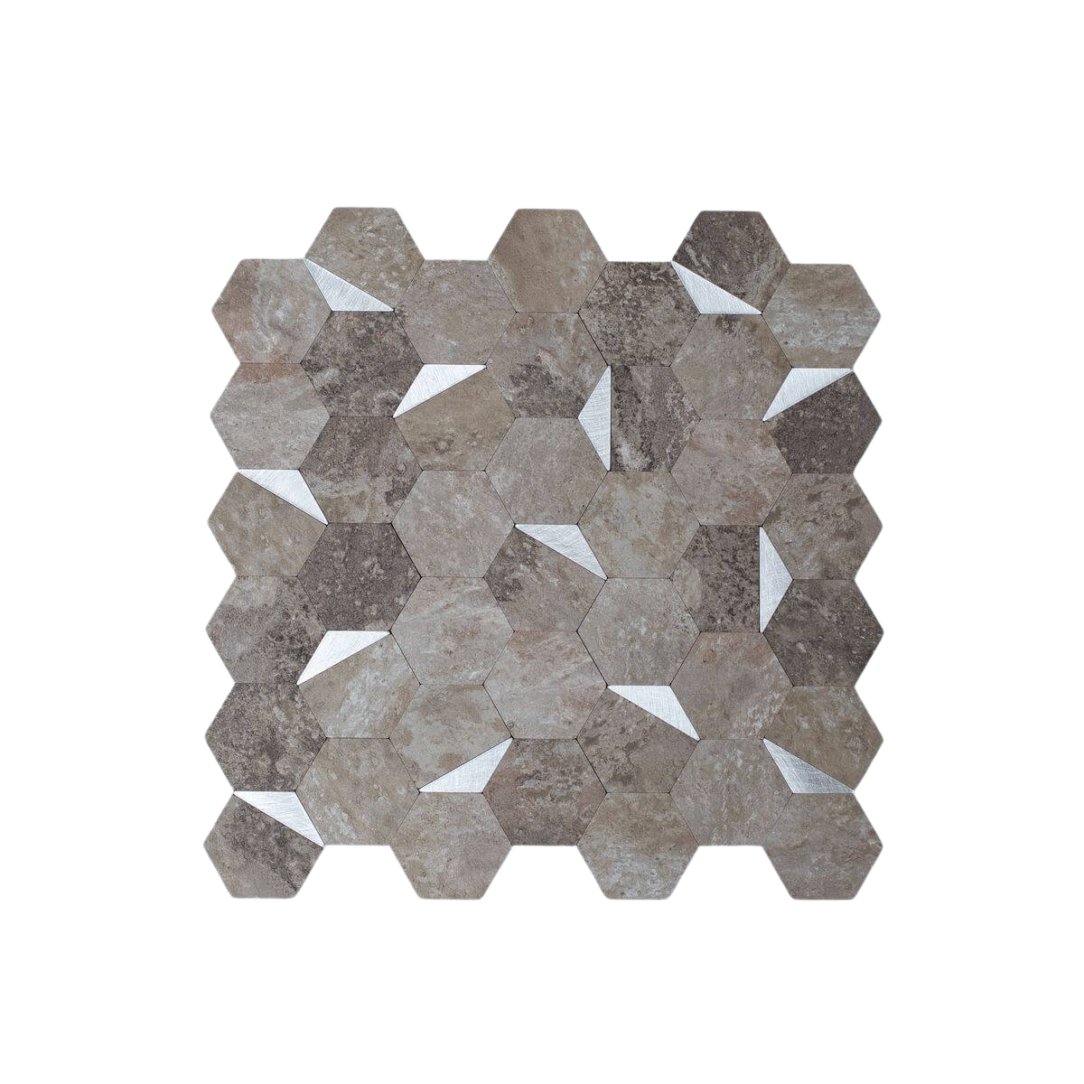 This hexagonal design combines the earthy elegance of stone textures with subtle metallic accents, creating a perfect balance between rustic charm and contemporary style. Lightweight yet durable, this panel is ideal for feature walls, kitchens, bathrooms or commercial spaces seeking a warm and refined aesthetic.
